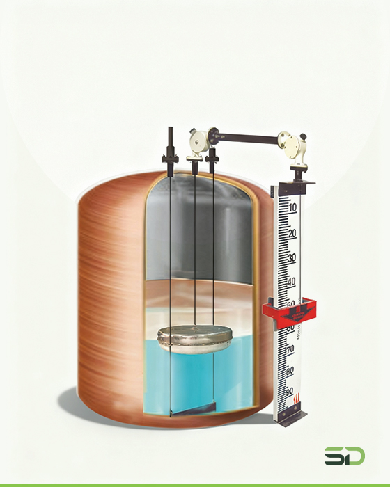 As the liquid rises in the tank, the large float also goes up, in turn moving the pointer on the graduated scale. The float is connected to the pointer with the wire rope which glides over almost frictionless nylon rollers, thereby ensuring trouble free operation.